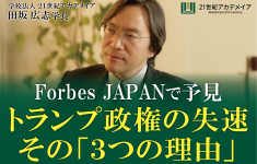 21世紀アカデメイアの田坂広志学長が、経済誌「Forbes JAPAN」に寄稿。いま絶頂のトランプ政権が、なぜ、まもなく組織的混乱と公約不履行、支持率激減に向かうかを、経営の視点から予見!